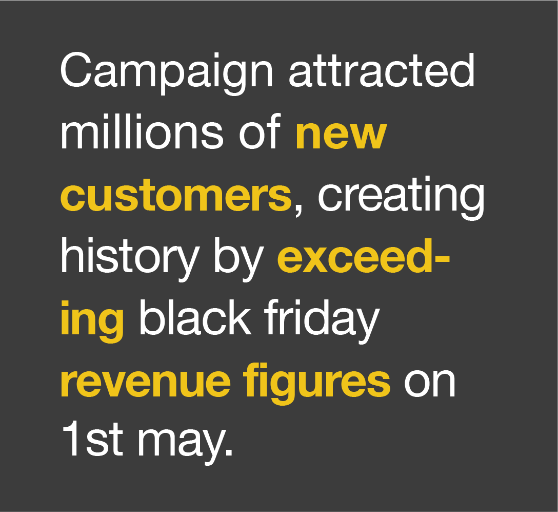 The campaign overdelivered and far exceeded targets by adding millions of new customers and higher than expected revenue targets with the 1st May being the highest revenue in its history beating Black Friday revenue figures.